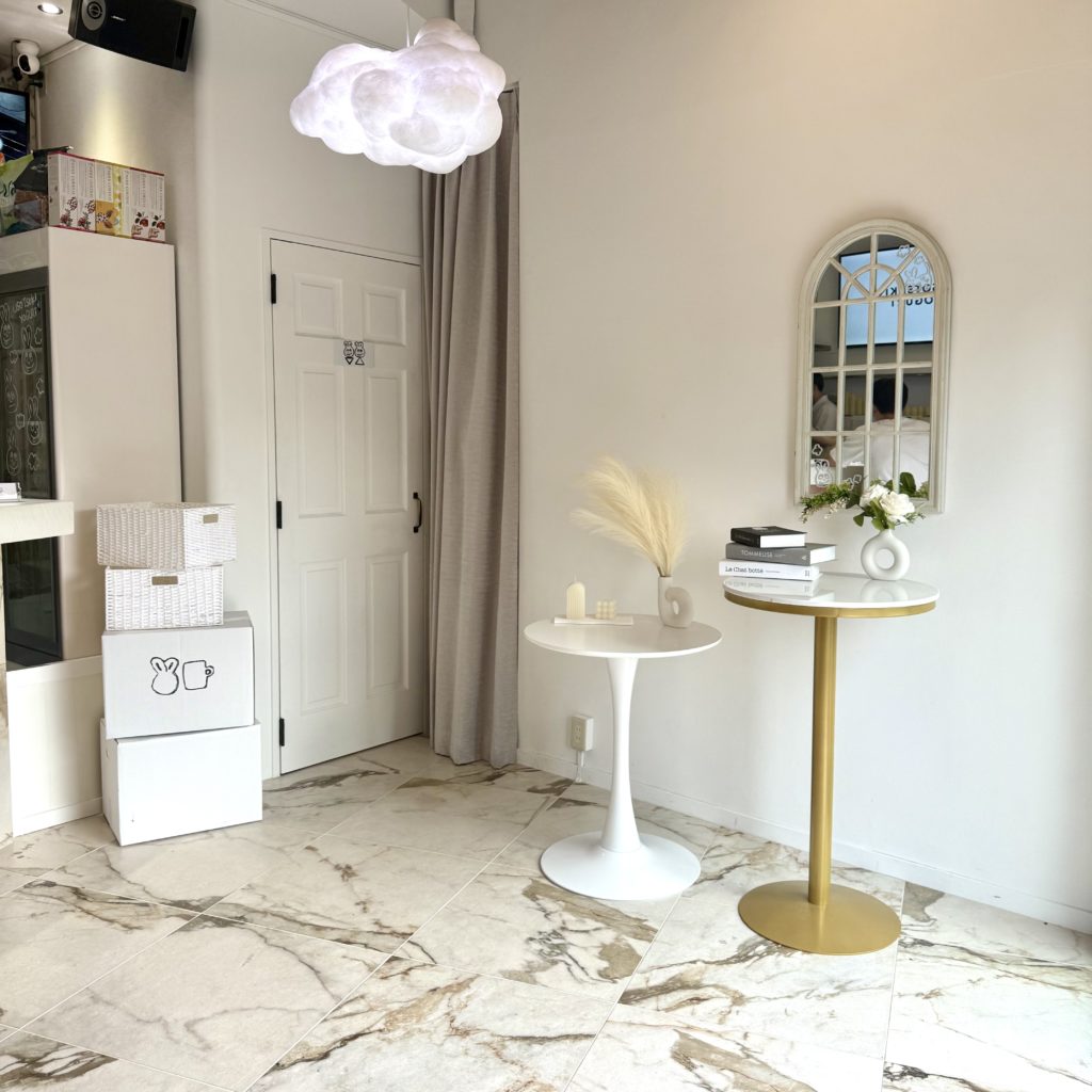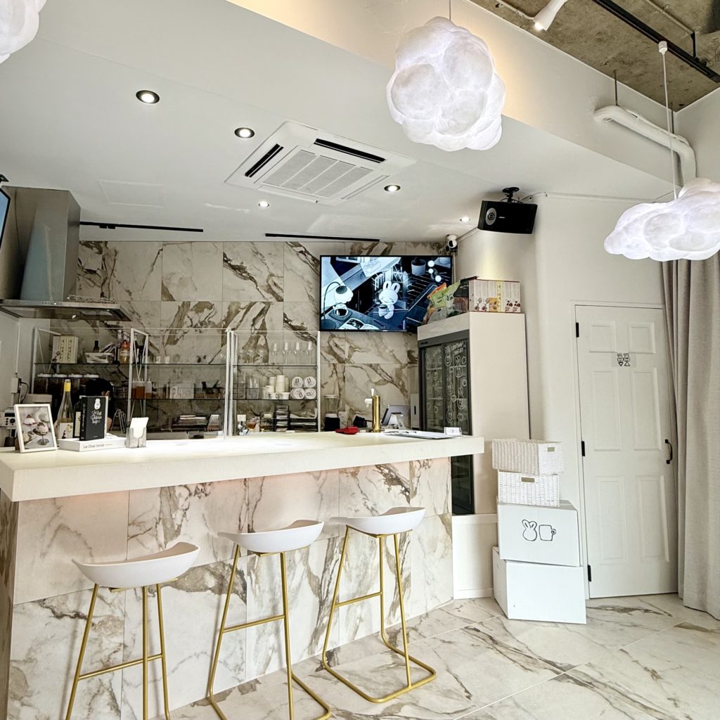 こじんまりとした小さな店内は白で統一された淡色系のおしゃれインテリアで、雲のライトや大理石のカウンターテーブルなど流行りの韓国カフェ的な雰囲気も感じられます。カウンター席のみ(9席)の小さなお店なので混雑時はあっという間に満席になってしまうかもしれません。※筆者は念のためインスタグラムのDMよりお席の予約をしてから伺いました。