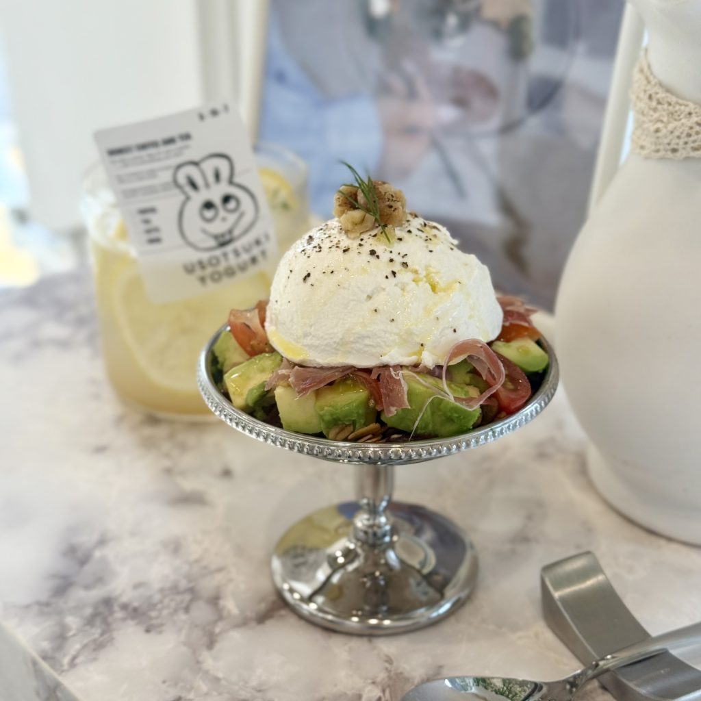 しょっぱい系も食べたくて、こちらのカプレーゼもオーダーしました。アボカドと生ハムの塩気にヨーグルトのまろやかな甘みが絶妙なハーモニーで、とっても美味しかったです。そして、なんとUSOTSUKI YOGURTさんでは全部のメニューにハチミツがかけ放題!!写真を撮るのを忘れましたがハチミツのボトルも一緒に提供してくださいます。ハチミツ好きにはたまらない嬉しいサービスですね( *´艸`)甘い系はもちろん、しょっぱい系のメニューにもハチミツは相性バッチリでした♪